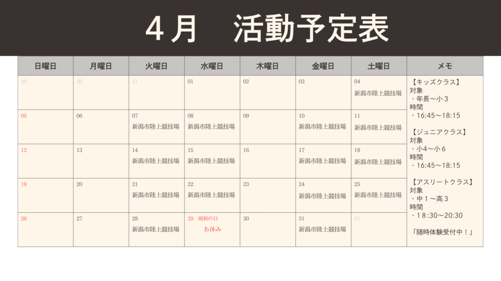 4月・5月の活動予定表 2026年3月31日 最終更新日時 : 2026年4月6日 u@c8284 活動会場の予定をお知らせします。いよいよ始動、初回活動日は4月4日(土)〜スクール生、随時募集中です!無料体験もお受けいたします。